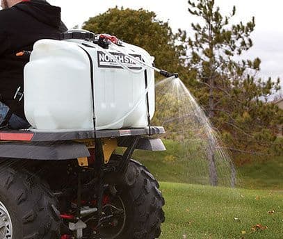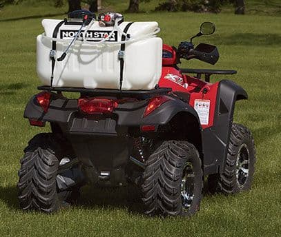 Tank has a 150mm opening and an easy-empty bottom drain. Compatible with Roundup® brand agricultural herbicide. Includes tie-down straps and remote switch with battery clips. Equipped with unique broadcast nozzles to produce a heavier droplet pattern, this NorthStar Sprayer minimizes drift, putting fertilizers and chemicals only where you want.